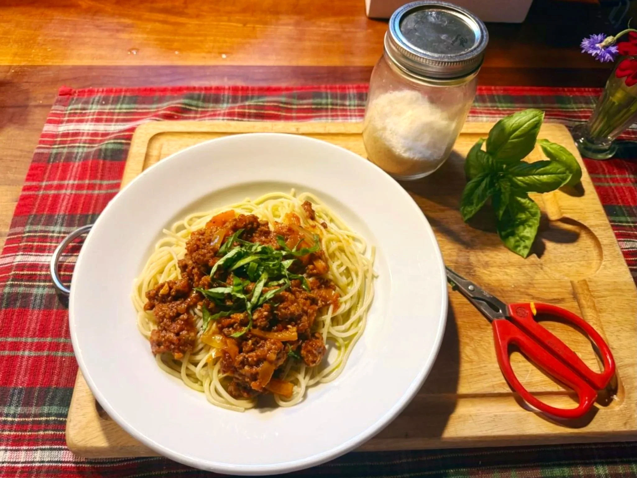 ๐ Garnish with fresh basil, cut with your Joyce Chen Scissors. Fresh basil is a must to bring brightness and another layer of goodness to your spaghetti!