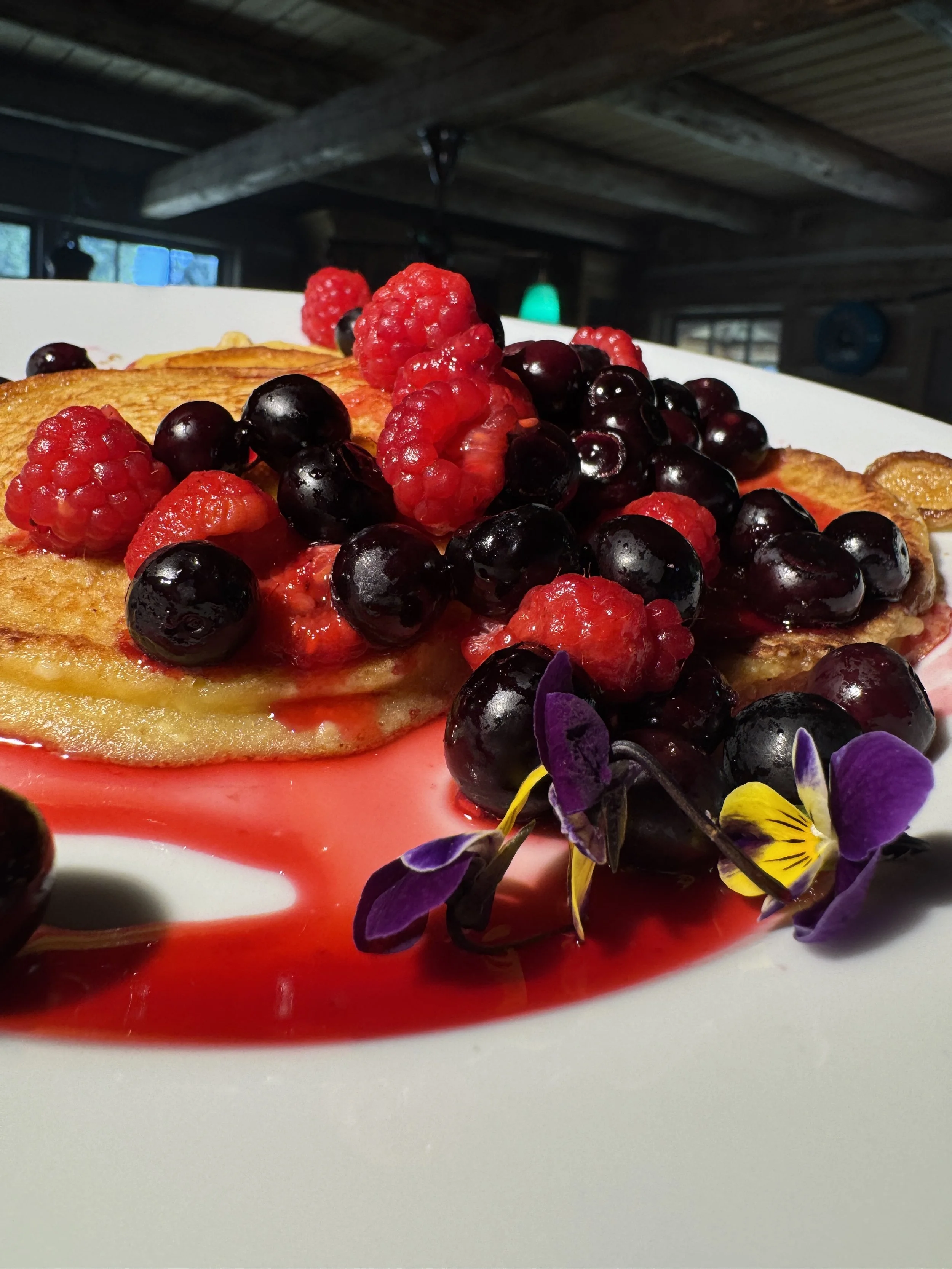 Sauté berries quickly, only a few minutes to warm and bring out the sweetness. Plate the pancakes, serve with warmed berries. Some like additional maple syrup,